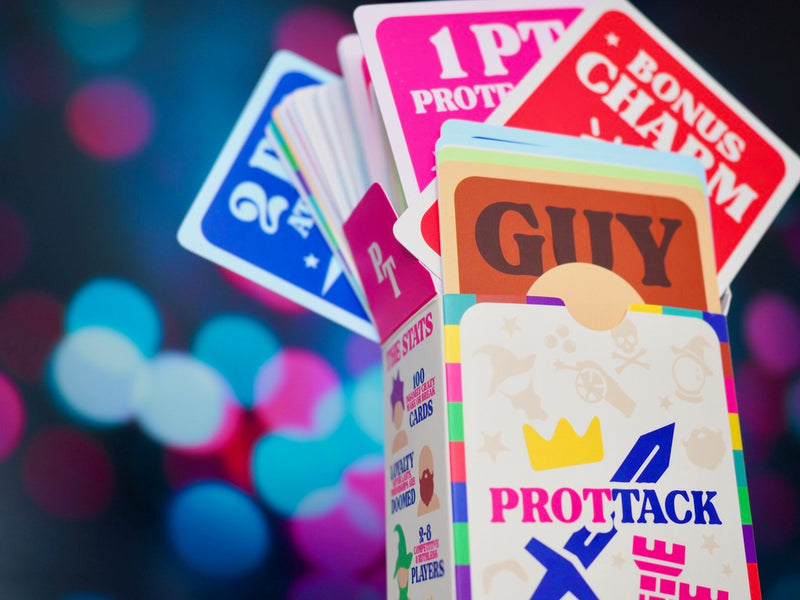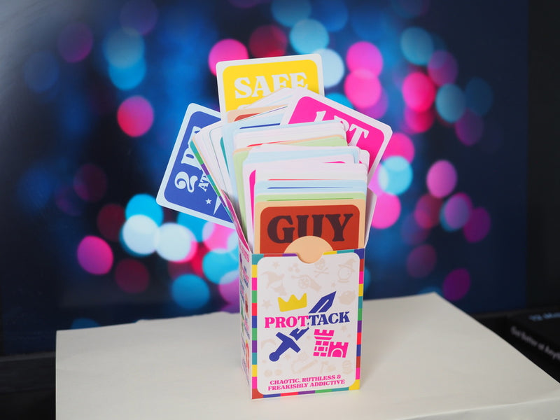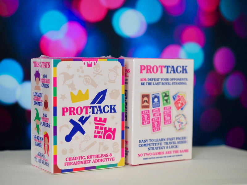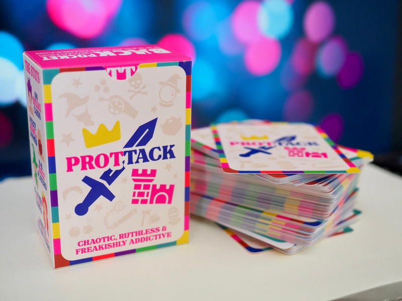 PROTTACK is our signature pocket-sized card game, a mix of strategy, sabotage, and sheer dumb luck. It’s competitive, portable, and guaranteed to cause at least one dramatic friendship fallout (in the best way).