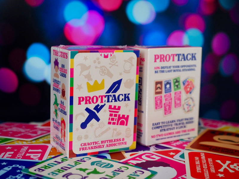 PROTTACK is our signature pocket-sized card game, a mix of strategy, sabotage, and sheer dumb luck. It’s competitive, portable, and guaranteed to cause at least one dramatic friendship fallout (in the best way).